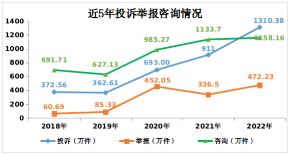 2022年,全國市場監(jiān)管部門通過全國12315平臺、電話、傳真、窗口等渠道共受理消費者投訴、舉報和咨詢2940.77萬件,同比增長23.5%。其中,投訴1310.38萬件,舉報472.23萬件,為消費者挽回經(jīng)濟(jì)損失45.19億元,有力保護(hù)了消費者合法權(quán)益。主要呈現(xiàn)十大特點: