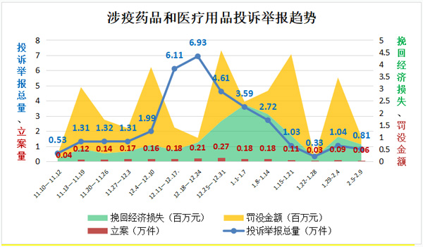 “二十條”和“新十條”出臺后,疫情防疫重心從防控感染轉(zhuǎn)到醫(yī)療救治,涉疫藥品和醫(yī)療用品需求激增、供應(yīng)不暢,價格異常波動、產(chǎn)品質(zhì)量問題頻現(xiàn),相關(guān)投訴舉報咨詢量一度呈井噴式增長。2022年11月10日至2022年底,全國12315平臺接收相關(guān)投訴舉報24.11萬件,同比增長3.88倍,環(huán)比增長2.95倍,最高峰值達(dá)到19.5倍。其中,投訴14.18萬件,舉報9.93萬件,挽回經(jīng)濟(jì)損失498.17萬元。