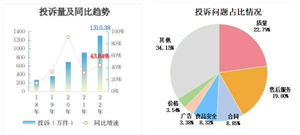 2022年,全國市場監(jiān)管部門受理消費者投訴1310.38萬件,同比增長43.84%,增速較2021年有所放大。從投訴問題看,質(zhì)量298.70萬件、售后服務(wù)248.96萬件、合同115.91萬件、食品安全109.06萬件,合計占投訴的58.96%。其中,售后服務(wù)問題增長最快,群眾反映最強(qiáng)烈,同比增長57.67%。
