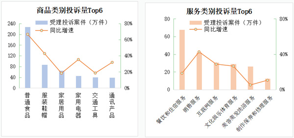 2022年,全國市場監(jiān)管部門共受理商品投訴862.32萬件,占投訴的65.81%,較上年提高4.37個百分點;服務(wù)投訴448.06萬件,占投訴的34.19%。商品類投訴占比提升,反映了實體經(jīng)濟(jì)下行壓力下產(chǎn)品質(zhì)量問題凸顯,其中投訴量靠前的是:普通食品、服裝鞋帽、家居用品、家用電器、交通工具、通訊產(chǎn)品,占比58.43%。服務(wù)投訴量靠前的是:餐飲住宿、銷售、互聯(lián)網(wǎng)服務(wù)、文化娛樂體育、美容美發(fā)洗浴,占比46.37%。
