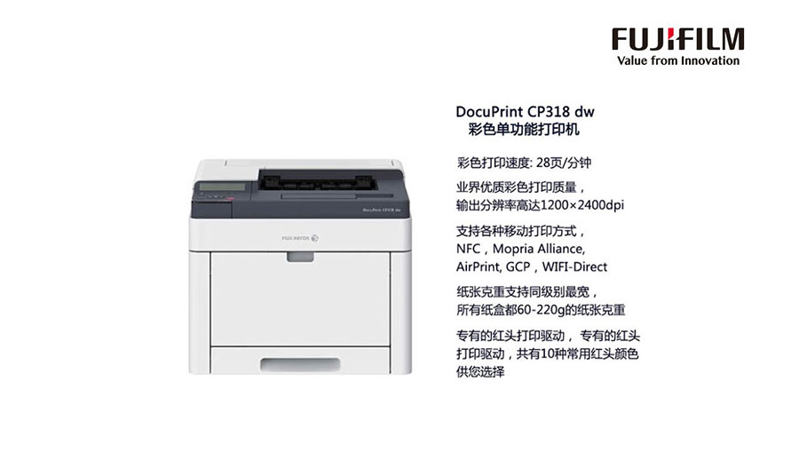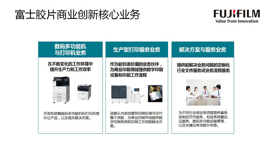富士膠片商業(yè)創(chuàng)新(中國)有限公司主要向中國市場提供能滿足企業(yè)不同需求的文件管理設(shè)備、解決方案和服務(wù),包括:智能型彩色數(shù)碼多功能機(jī)、激光打印機(jī)/多功能一體機(jī);能滿足個(gè)性化、批量打印等需求的數(shù)字印刷系統(tǒng)和大幅面工程系統(tǒng);以及針對企業(yè)文印和業(yè)務(wù)流程等的外包服務(wù)。富士膠片商業(yè)創(chuàng)新(中國)不斷推出采用云、移動、機(jī)器人自動化流程和人工智能等技術(shù)的全行業(yè)數(shù)字化解決方案與服務(wù),為企業(yè)打造數(shù)字化工作空間、數(shù)字化生產(chǎn)力、數(shù)字化工作流程,幫助企業(yè)改善業(yè)務(wù)流程,改變工作方式,加速數(shù)字化轉(zhuǎn)型。該公司在北京、上海、廣州、深圳、沈陽、天津、武漢、成都等城市設(shè)有分支機(jī)構(gòu)。