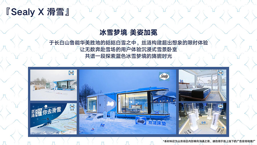 于長白山魯能華美勝地的皚皚白雪之中,絲漣構(gòu)建超出想象的限時體驗,讓無數(shù)奔赴雪場的用戶體驗沉浸式雪景臥室,共譜一段探索藍色冰雪夢境的旖旎時光。