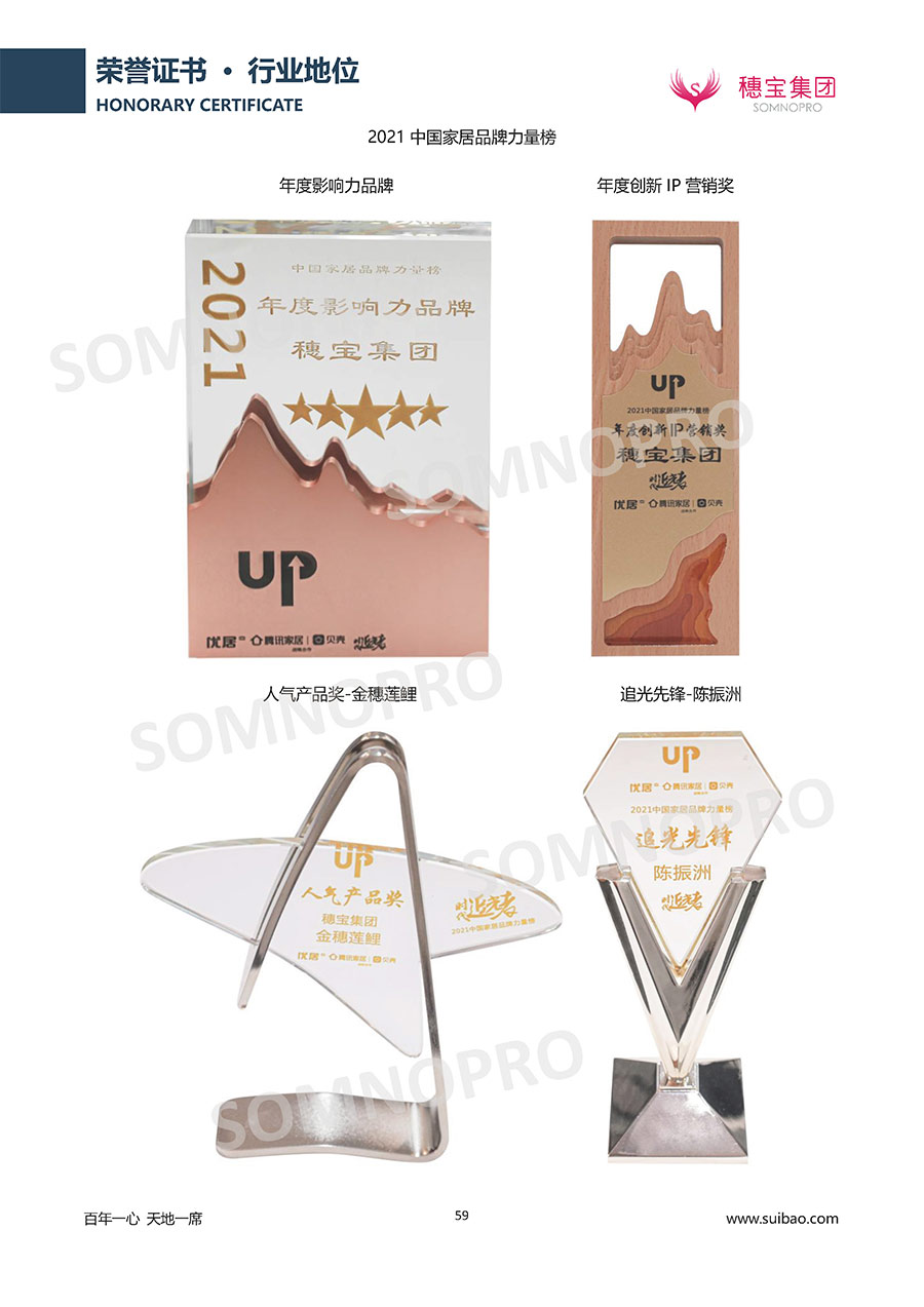 自1971年獨(dú)立研發(fā)生產(chǎn)出專屬國(guó)人的彈簧床墊,穗寶關(guān)于優(yōu)質(zhì)深度睡眠的研究已有半個(gè)世紀(jì)的歷史。穗寶一直專注床墊,專注中國(guó)消費(fèi)者的睡眠研究,針對(duì)中國(guó)人特點(diǎn)進(jìn)行優(yōu)化創(chuàng)新,不斷提升國(guó)人的睡眠體驗(yàn),只為成就每個(gè)晚上8小時(shí)的優(yōu)質(zhì)深度睡眠。憑借不斷革新的研發(fā)科技和深受消費(fèi)者信賴的產(chǎn)品品質(zhì),穗寶集團(tuán)旗下品牌和產(chǎn)品屢獲國(guó)內(nèi)外大獎(jiǎng),連續(xù)20年榮膺中國(guó)500最具價(jià)值品牌,品牌價(jià)值高達(dá)302.89億元。