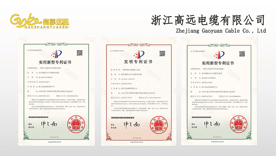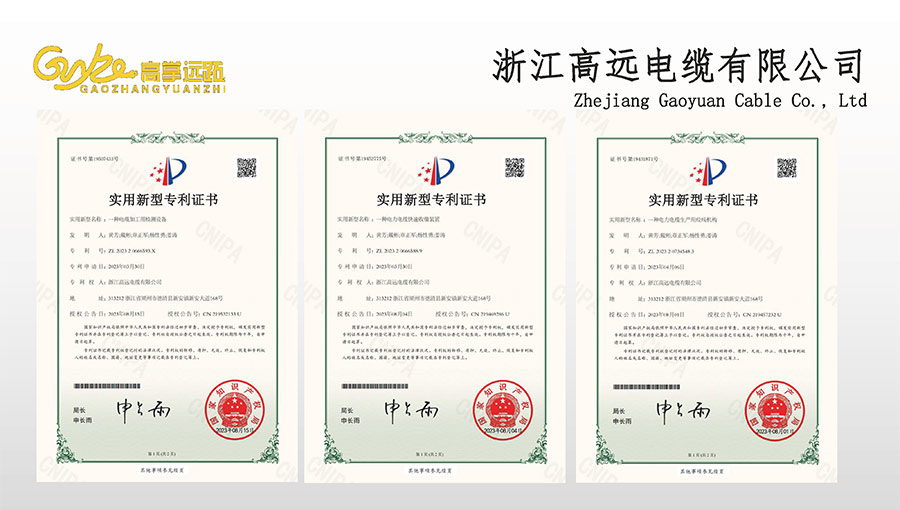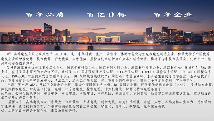 高遠(yuǎn)電纜是浙江省電線電纜重點(diǎn)工業(yè)企業(yè),浙江省專精特新企業(yè)、浙江省科技型企業(yè),浙江省標(biāo)準(zhǔn)化良好行為AAA級(jí)企業(yè);獲得了國家頒發(fā)的生產(chǎn)許可證,通過了CCC國家強(qiáng)制性產(chǎn)品認(rèn)證,ISO9001質(zhì)量體系認(rèn)證,ISO14001環(huán)境體系認(rèn)證,OHSAS18001職業(yè)健康安全管理體系認(rèn)證,PCCC產(chǎn)品認(rèn)證、B1級(jí)燃燒性能授權(quán)書;榮獲浙江省著名商標(biāo),浙江省重合同守信譽(yù)企業(yè),浙江省優(yōu)質(zhì)產(chǎn)品,市級(jí)研究開發(fā)中心,清潔工廠,綠色工廠等國家、省、市授權(quán)的榮譽(yù)稱號(hào),取得了多項(xiàng)發(fā)明專利、實(shí)用型專利。