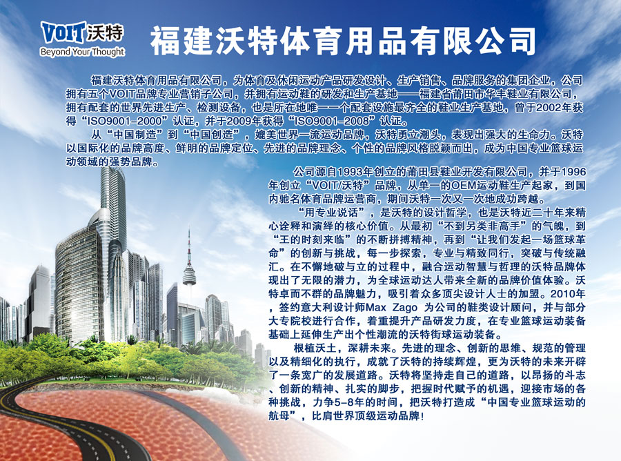 福建省莆田市華豐鞋業(yè)有限公司擁有世界先進(jìn)的制鞋生產(chǎn)線及配套生產(chǎn)、檢測設(shè)備,1996年自創(chuàng)“VOIT(沃特)”品牌產(chǎn)品在國際市場銷售。
