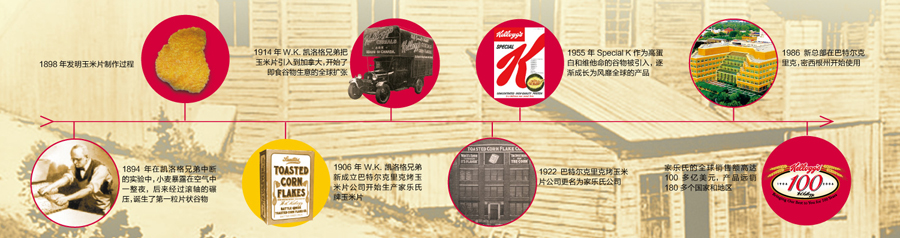 一百多年來(lái),家樂(lè)氏公司秉承“更健康、更營(yíng)養(yǎng)美味和更高質(zhì)量”的信念以及“天然和優(yōu)質(zhì)”的高尚品質(zhì),不斷地推陳出新,先后推出系列經(jīng)典 產(chǎn)品如All-Bran®(1916年)和 Rice Krispies®(1928年)。隨著業(yè)務(wù)的發(fā)展,家樂(lè)氏公司開(kāi)始拓展國(guó)際業(yè)務(wù):1914年Kellogg’s Corn Flakes®產(chǎn)品進(jìn)軍加拿大市場(chǎng),1924年和1938年分別在澳大利亞的悉尼、英格蘭的曼徹斯特設(shè)立工廠。2007年,家樂(lè)氏成功進(jìn)入中國(guó),并以銷售額接近120億美金的業(yè)績(jī)成為全球谷物食品和方便食品的領(lǐng)頭者,產(chǎn)品包括谷物類早餐、餅干、克力架、糕點(diǎn)、果味小食、燕麥餅干棒、冷凍華夫以及素食產(chǎn)品等。2012年6月,家樂(lè)氏在全球成功收購(gòu)品客品牌,使家樂(lè)氏的休閑產(chǎn)品成為繼谷物產(chǎn)品之后的第二大品牌。