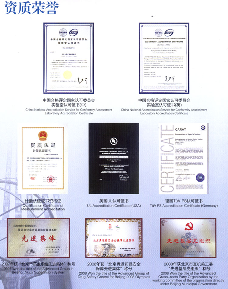 北京市醫(yī)療器械檢驗(yàn)所(國家食品藥品監(jiān)督管理局北京醫(yī)療器械質(zhì)量監(jiān)督檢驗(yàn)中心,以下簡稱“北檢所”)是中國合格評定國家認(rèn)可委員會(huì)(CNAS)、中國國家認(rèn)證認(rèn)可監(jiān)督管理委員會(huì)(CNCA)、國家食品藥品監(jiān)督管理局(SFDA)等部門認(rèn)可授權(quán)的一所綜合性醫(yī)療器械產(chǎn)品檢測機(jī)構(gòu)。經(jīng)CNAS授權(quán)的檢驗(yàn)范圍涵蓋醫(yī)用電子、醫(yī)用射線、核醫(yī)學(xué)、電聲學(xué)、體外診斷系統(tǒng)、一次性醫(yī)療產(chǎn)品、醫(yī)用防護(hù)用品、醫(yī)用橡膠制品、口腔材料、生物安全柜、電磁兼容、生物相容性等專業(yè)領(lǐng)域,檢驗(yàn)項(xiàng)目涉及472項(xiàng);經(jīng)SFDA授權(quán)檢測項(xiàng)目達(dá)599項(xiàng),承擔(dān)著授權(quán)范圍內(nèi)醫(yī)療器械產(chǎn)品監(jiān)督抽驗(yàn)檢驗(yàn)、注冊檢驗(yàn)、認(rèn)證檢驗(yàn)、進(jìn)出口商品檢驗(yàn)、科技成果鑒定檢驗(yàn)以及委托檢驗(yàn)、仲裁檢驗(yàn)等檢測任務(wù);2002年,成為中國質(zhì)量認(rèn)證中心(CQC)簽約實(shí)驗(yàn)室,承擔(dān)醫(yī)用X射線診斷設(shè)備、心電圖機(jī)、血液透析裝置和橡膠避孕套的強(qiáng)制性產(chǎn)品安全認(rèn)證檢測任務(wù)。此外,該所先后獲得TüV PS、UL等國際權(quán)威認(rèn)證機(jī)構(gòu)的認(rèn)可,是目前國內(nèi)開展檢驗(yàn)業(yè)務(wù)專業(yè)最全面的醫(yī)療器械檢驗(yàn)機(jī)構(gòu)。