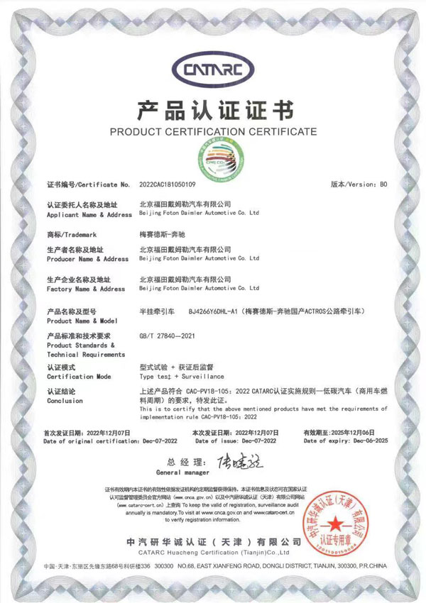 梅賽德斯-奔馳國(guó)產(chǎn)重卡Actros 6×4公路牽引車獲“低碳汽車(商用車燃料周期)”認(rèn)證證書