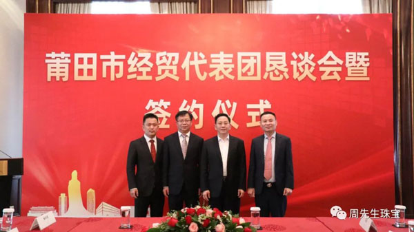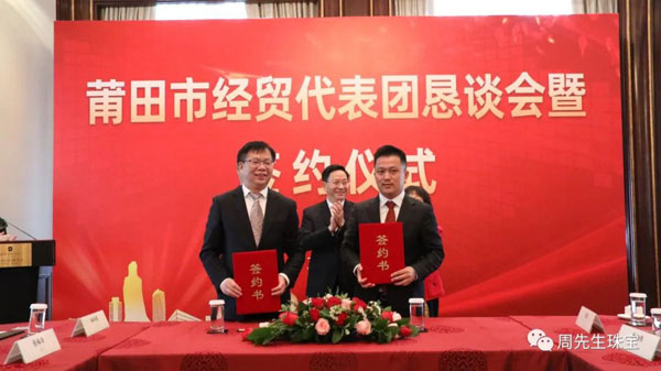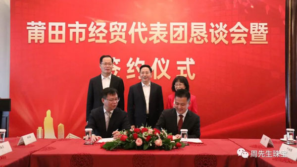 懇談會期間,莆田經(jīng)貿(mào)代表團與眾多莆仙籍企業(yè)家面對面交流,就共同推進項目合作達成諸多意向,舉行了簽約儀式。香港周先生珠寶金行國際集團有限公司作為應邀出席的企業(yè)之一,在眾多領導的見證下簽署“香港周先生珠寶金行國際集團有限公司供應鏈平臺”項目合作協(xié)議 。