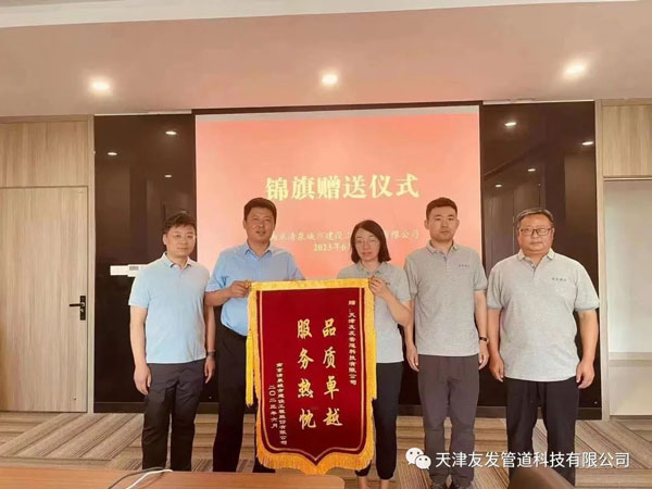 2023年6月,南京清泉城市建設工程股份有限公司送予天津友發(fā)管道科技有限公司“品質(zhì)卓越 服務熱忱”的錦旗,對我公司產(chǎn)品質(zhì)量及售后服務表示認可和感謝。