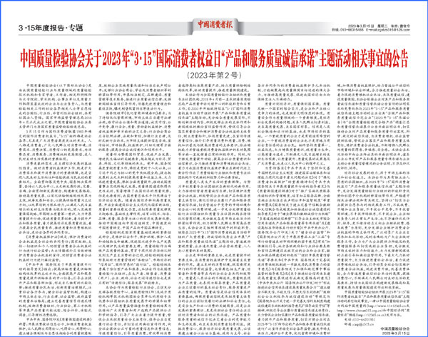 中國經(jīng)濟網(wǎng)北京3月15日訊(記者 佟明彪 蘇蘭) 春來潮涌,奮楫揚帆。在2023年“3·15”國際消費者權(quán)益日到來之際,中國質(zhì)量檢驗協(xié)會(以下簡稱質(zhì)檢協(xié)會)組織開展2023年“3·15”“產(chǎn)品和服務(wù)質(zhì)量誠信承諾”主題活動,包括中國航天科技、格力、美的、紅九九、名臣健康、安莉芳等各行各業(yè)2000多家優(yōu)秀企業(yè)積極響應(yīng)參與,在推動經(jīng)營者質(zhì)量誠信自律、維護消費者合法權(quán)益、持續(xù)優(yōu)化營商環(huán)境等方面展現(xiàn)了質(zhì)量領(lǐng)域社團組織在新時代的新作用。
