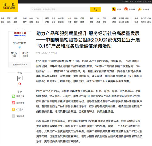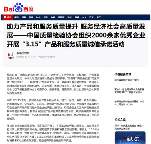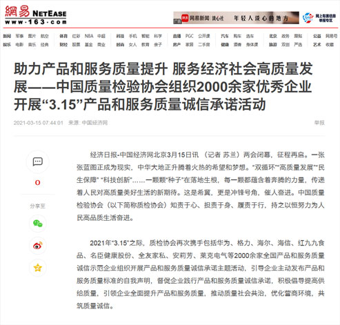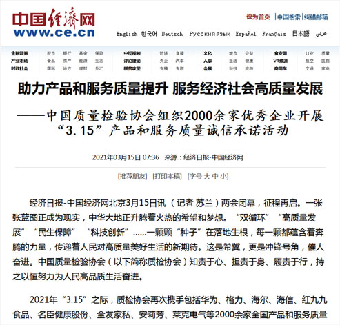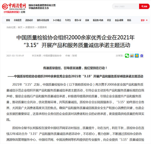 中國經(jīng)濟(jì)網(wǎng):傳遞質(zhì)量信任、引導(dǎo)質(zhì)量消費(fèi),我們堅持在行動!——中國質(zhì)量檢驗協(xié)會組織2000余家優(yōu)秀企業(yè)在2021年“3.15”開展產(chǎn)品和服務(wù)質(zhì)量誠信承諾主題活動