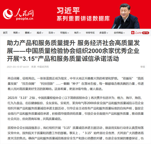 人民網(wǎng):2000家質(zhì)量領(lǐng)先企業(yè)開展 "3.15"產(chǎn)品和服務(wù)質(zhì)量誠信承諾活動