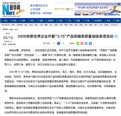 新華網(wǎng):2000余家優(yōu)秀企業(yè)開展“3.15”產(chǎn)品和服務(wù)質(zhì)量誠信承諾活動