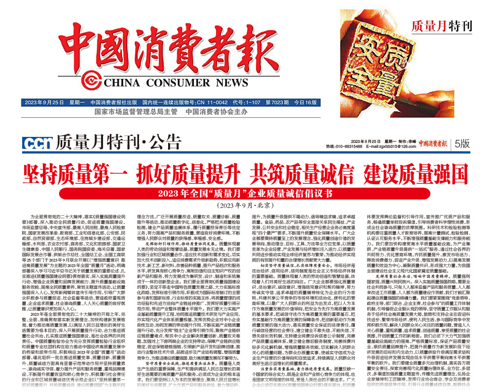 - 中國(guó)消費(fèi)者報(bào)——堅(jiān)持質(zhì)量第一 抓好質(zhì)量提升 共筑質(zhì)量誠(chéng)信 建設(shè)質(zhì)量強(qiáng)國(guó)——2023年全國(guó)“質(zhì)量月”企業(yè)質(zhì)量誠(chéng)信倡議書